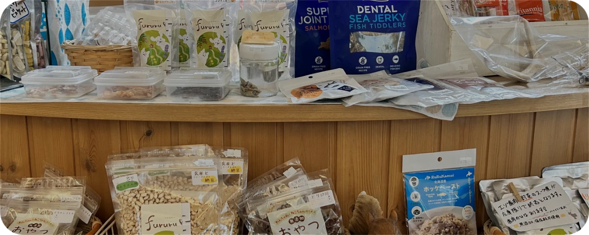 当院では獣医師とスタッフが、この世に多数流通するフードの中から厳選したナチュラルフードやおやつを取り揃えております。